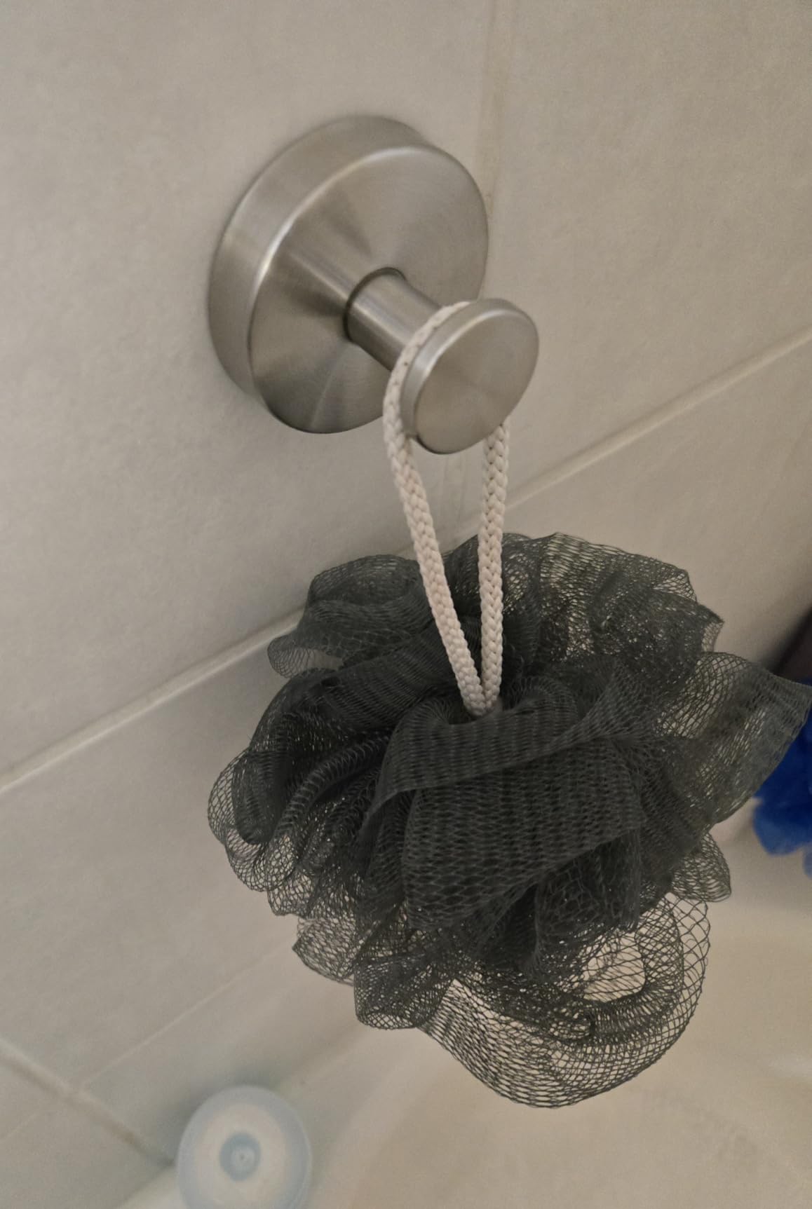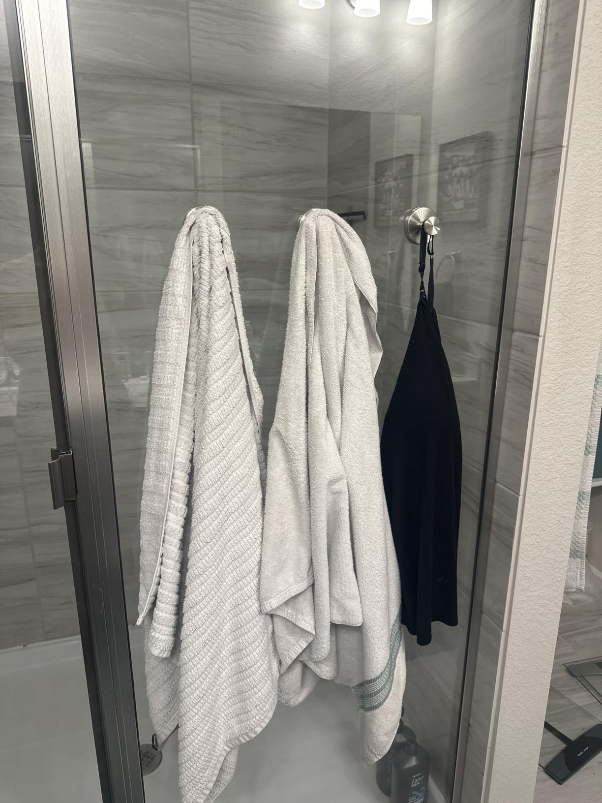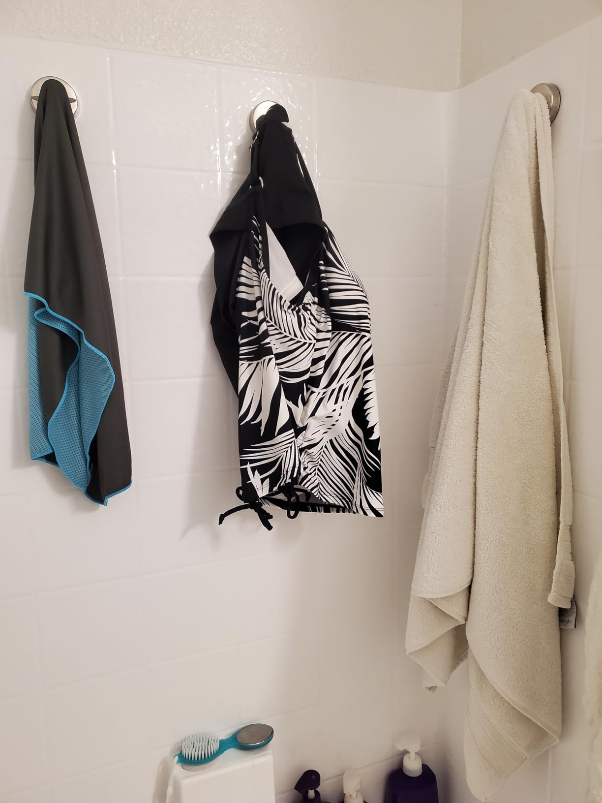 Each hook holds up to 15 lbs when properly installed. Perfect for towels, robes, loofahs, and light bags.